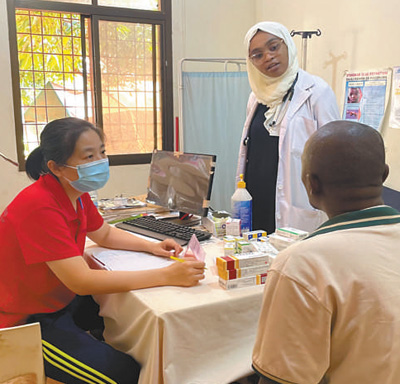 醫(yī)療隊(duì)在桑給巴爾島開展義診,圖為內(nèi)科醫(yī)生劉翠霞(左一)接診患者。