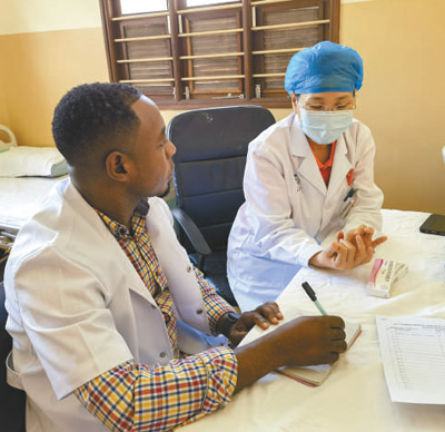 醫(yī)療隊(duì)在奔巴島開展義診,圖為婦產(chǎn)科醫(yī)生史曉瑩(右)同當(dāng)?shù)蒯t(yī)生交流患者情況。