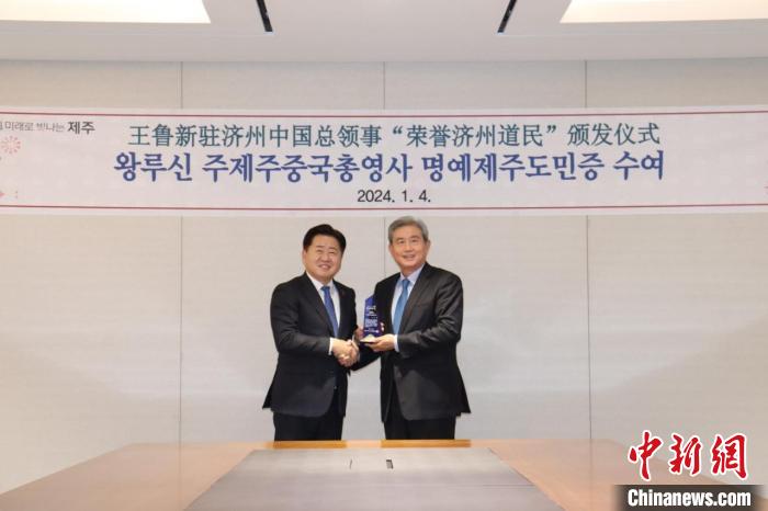 1月4日,韓國(guó)濟(jì)州道知事吳憐勛(左)向中國(guó)駐濟(jì)州總領(lǐng)事王魯新頒授“榮譽(yù)濟(jì)州道民”證書。(中國(guó)駐濟(jì)州總領(lǐng)事館供圖)