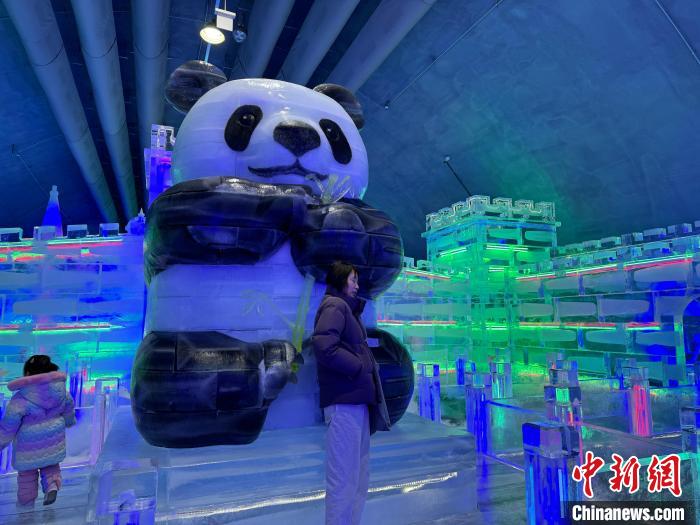 圖為游客和熊貓冰雕合影。記者 劉旭 攝