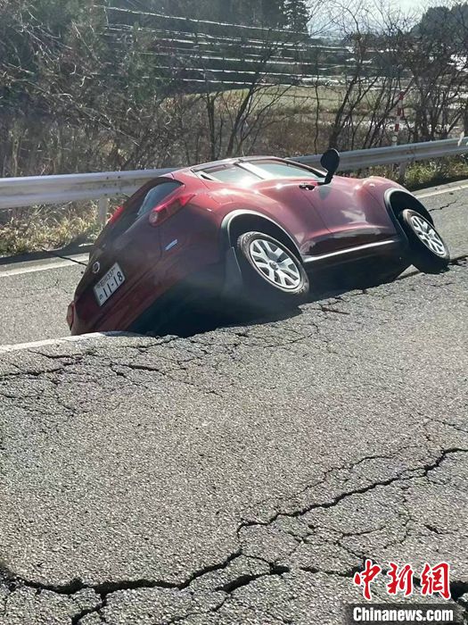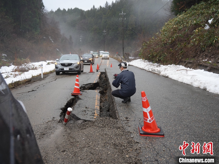 圖為1月3日石川縣輪島市周邊,地震導(dǎo)致道路損壞。 中新社發(fā) 劉勇 攝