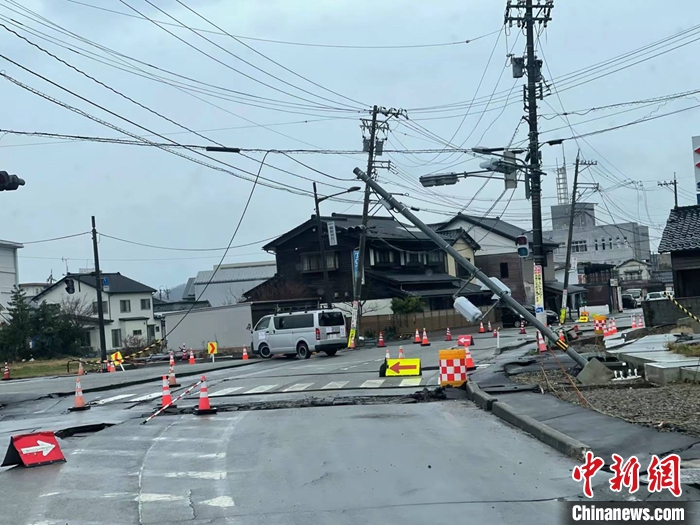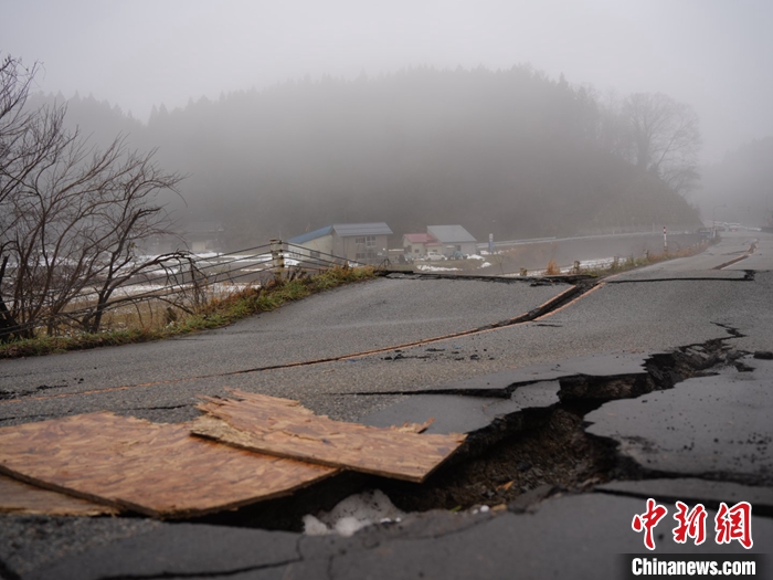 圖為1月3日,石川縣輪島市周邊,地震導(dǎo)致道路損壞。 中新社發(fā) 劉勇 攝