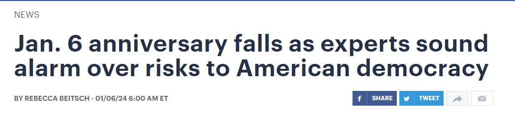 這項(xiàng)民調(diào)結(jié)果公布之時,正值“國會山騷亂”事件三周年之際,美國也迎來新的選舉年?!秶鴷綀?bào)》網(wǎng)站在6日的報(bào)道中再次提到,目前美國出現(xiàn)了一系列與民主狀況有關(guān)的令人不安的跡象。