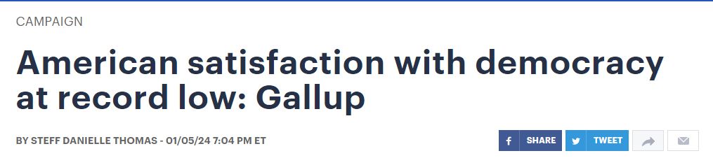 中國日報(bào)網(wǎng)1月8日電 據(jù)美國《國會山報(bào)》網(wǎng)站5日報(bào)道,蓋洛普公司(Gallup)5日公布的民調(diào)顯示,只有28%的美國成年人對該國的民主現(xiàn)狀感到滿意,較2021年1月6日美國“國會山騷亂”事件發(fā)生后不久的35%的調(diào)查結(jié)果又有了明顯的下降,創(chuàng)歷史新低。