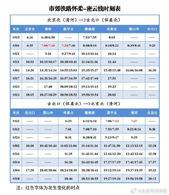 中新網(wǎng)1月9日電 據(jù)北京市郊鐵路官方微博消息,2024年1月10日起,北京市郊鐵路懷柔-密云線(xiàn)列車(chē)開(kāi)行時(shí)點(diǎn)調(diào)整,具體列車(chē)時(shí)刻表如下圖所示: