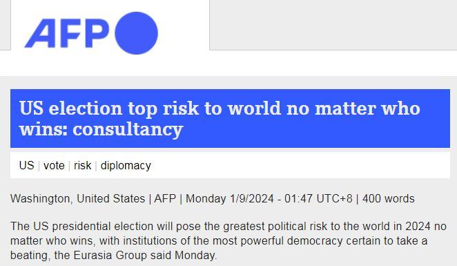 中新網(wǎng)1月10日電 據(jù)法新社報道,日前,政治風險咨詢公司歐亞集團表示,無論誰獲勝,2024年美國總統(tǒng)選舉都將給世界帶來最大政治風險,美國制度將會受到打擊。
