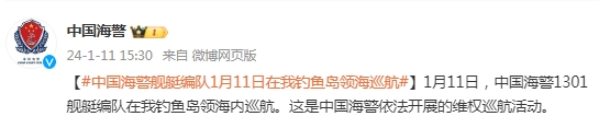 中新網(wǎng)1月11日電 據(jù)中國(guó)海警局官方微博消息,1月11日,中國(guó)海警1301艦艇編隊(duì)在我釣魚島領(lǐng)海內(nèi)巡航。這是中國(guó)海警依法開展的維權(quán)巡航活動(dòng)。