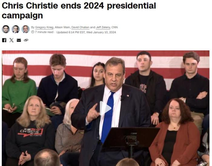 中新網(wǎng)1月11日電 綜合外媒報(bào)道,美國前新澤西州州長克里斯蒂(Chris Christie)當(dāng)?shù)貢r(shí)間10日宣布結(jié)束2024年美國總統(tǒng)競選。盡管克里斯蒂作為初選“戰(zhàn)場”上前總統(tǒng)特朗普的主要批評者而備受關(guān)注,但他并未能在民調(diào)中獲得廣泛支持。