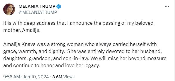梅拉尼婭在X平臺(tái)上發(fā)文稱(chēng),“我懷著沉痛的心情宣布,我深?lèi)?ài)的母親阿瑪利加去世了。阿瑪利加·納夫斯是一名堅(jiān)強(qiáng)的女性,她總是舉止優(yōu)雅、溫暖、莊重。”她寫(xiě)道,“她深深地愛(ài)著她的丈夫、女兒、外孫和女婿。我們會(huì)無(wú)比地懷念她,也會(huì)繼續(xù)尊重和愛(ài)戴她留下的寶貴財(cái)富?!?/p>