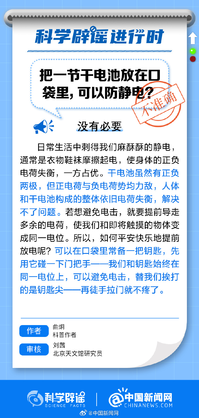 中新網(wǎng)1月11日電 干電池雖然有正負(fù)兩極,但正電荷與負(fù)電荷勢均力敵,人體和干電池構(gòu)成的整體依舊電荷失衡,解決不了問題。若想避免電擊,就要提前導(dǎo)走多余的電荷,使我們和即將觸摸的物體變成同一電位。所以,如何平安快樂地提前放電呢? 可以在口袋里常備一把鑰匙,先用它碰一下門把手。(來源:@科學(xué)辟謠 中國新聞網(wǎng))
