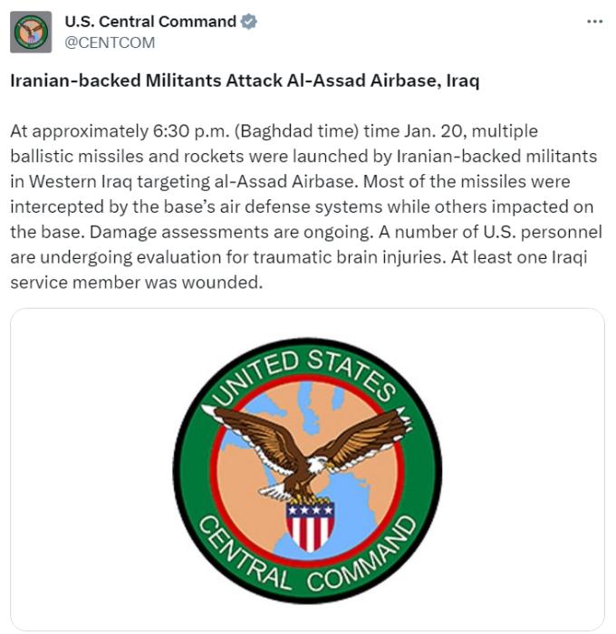 據(jù)報(bào)道,美國(guó)中央司令部在一份聲明中稱(chēng),伊朗支持的武裝分子20日在伊拉克西部,向阿薩德空軍基地發(fā)射了多枚彈道導(dǎo)彈和火箭彈,其中大部分導(dǎo)彈被基地的防空系統(tǒng)攔截,其他則擊中了基地。