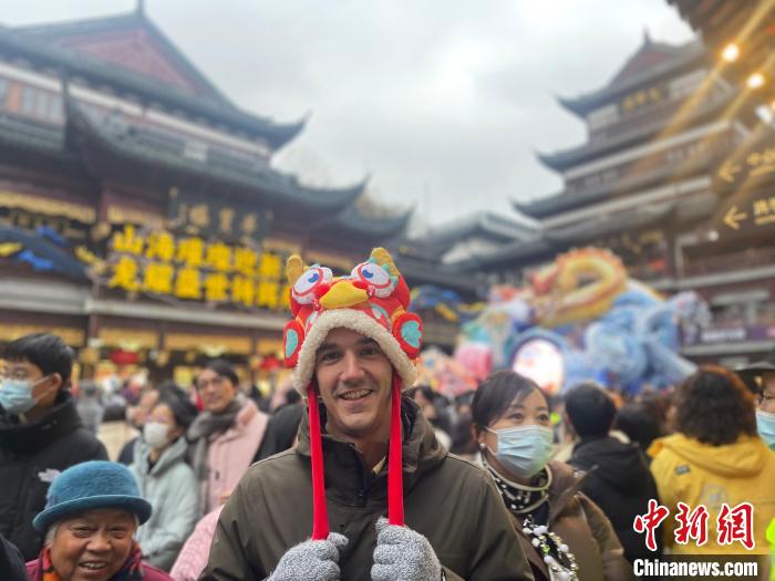 1月21日,2024豫園燈會正式亮燈,一名西班牙小伙兒在現場觀燈。中新網記者 鄭瑩瑩 攝