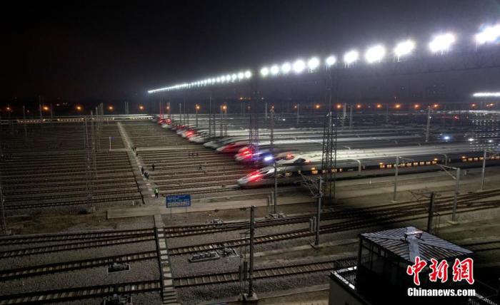 資料圖:航拍動(dòng)車(chē)組??吭谖錆h動(dòng)車(chē)段的存車(chē)線上,蓄勢(shì)待發(fā)。 張暢 攝
