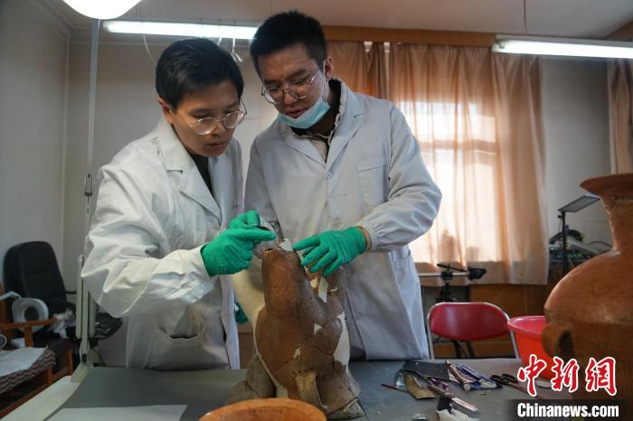 圖為正在被修復(fù)的陶器。 中新網(wǎng)記者李江寧 攝