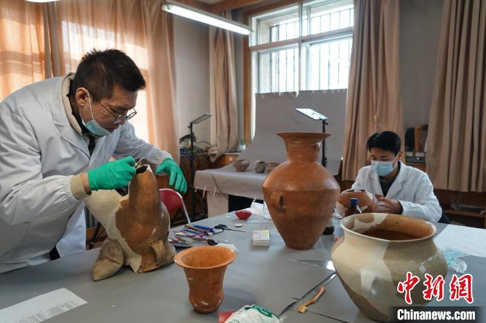 23日,中新網(wǎng)記者來到青海省文物考古研究院,看到文物修復(fù)工作室內(nèi),幾名年輕人正拿著修復(fù)工具小心翼翼地粘接碎陶片,大碎片如手掌大小,小碎片只有硬幣大小。工作臺上放置著幾件剛剛完成復(fù)原的陶器。