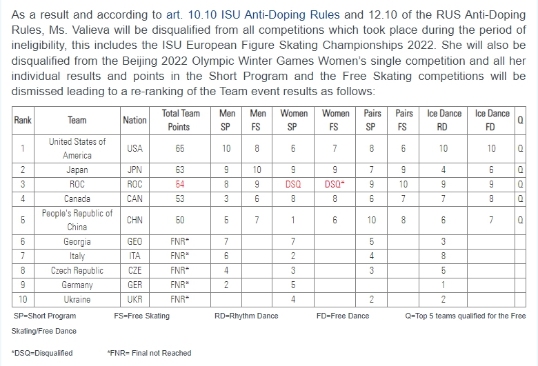 當(dāng)?shù)貢r(shí)間30日,國(guó)際滑聯(lián)對(duì)北京冬奧會(huì)花樣滑冰團(tuán)體成績(jī)進(jìn)行了重新計(jì)算,瓦利耶娃所獲得的成績(jī)積分被取消,俄羅斯奧委會(huì)代表團(tuán)在花樣滑冰團(tuán)體項(xiàng)目中的金牌變?yōu)殂~牌。
