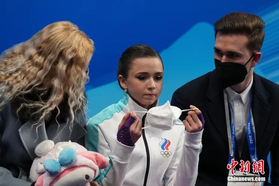 瓦利耶娃(中)在北京冬奧會(huì)比賽結(jié)束后等待分?jǐn)?shù) 資料圖 中新社記者 崔楠 攝