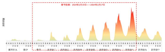 此外,春節(jié)期間出程與節(jié)日后期返程的潮汐特征明顯,9-12時(shí)和14-19時(shí)為易發(fā)生擁堵時(shí)段。