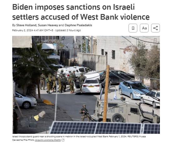 據(jù)路透社報(bào)道,拜登1日簽署了一項(xiàng)行政命令,宣布全國進(jìn)入緊急狀態(tài),允許其采取新措施打擊定居者的暴力行為,同時(shí)宣布對(duì)在約旦河西岸實(shí)施暴力行為的四名以色列極端分子實(shí)施制裁。