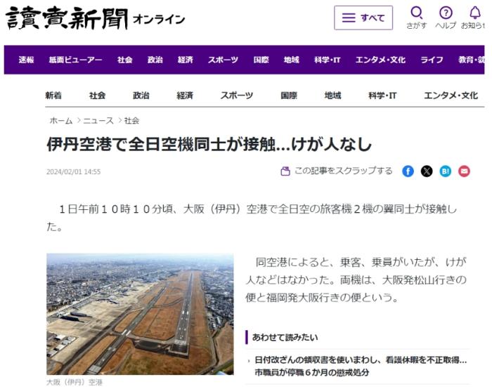 中新網(wǎng)2月1日電 據(jù)日本《讀賣新聞》報(bào)道,當(dāng)?shù)貢r(shí)間2月1日上午10時(shí)10分許,日本大阪伊丹機(jī)場的2架客機(jī)機(jī)翼部位發(fā)生擦碰。