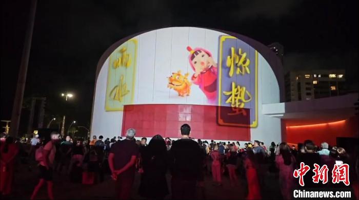當(dāng)天晚上,多娜·琳杜公園內(nèi)劇院的外墻,投影出中國文化元素?zé)艄庑?。畫面中,十二個生肖福娃次第給觀眾拜年,中國傳統(tǒng)時令節(jié)氣習(xí)俗一一展演,格外吸睛。