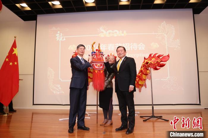 當?shù)貢r間2月1日晚,加拿大首都渥太華,中國駐加拿大大使館舉行2024年春節(jié)招待會。圖為中國駐加拿大大使叢培武(左)與加拿大聯(lián)邦參議員胡子修共同為舞龍點睛。中新網記者 余瑞冬 攝
