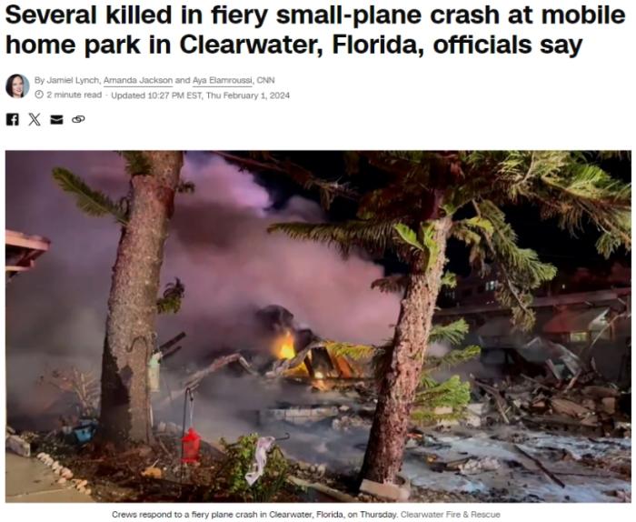 當(dāng)?shù)貢r(shí)間2月1日,美國(guó)佛州一架小型飛機(jī)墜毀。圖片來(lái)源:美國(guó)有線電視新聞網(wǎng)(CNN)報(bào)道截圖