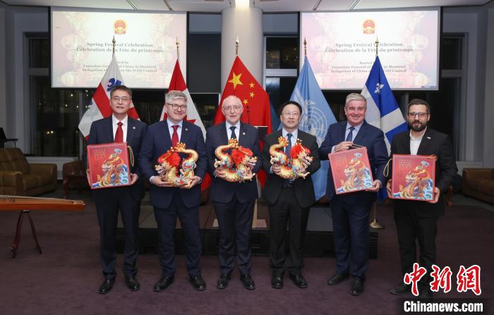 當(dāng)?shù)貢r(shí)間2月6日晚,加拿大蒙特利爾,中國駐蒙特利爾總領(lǐng)館與中國常駐國際民航組織理事會(huì)代表處在國際民航組織(ICAO)總部聯(lián)合舉辦“共慶春節(jié)”主題活動(dòng)。圖為國際民航組織理事會(huì)主席夏基塔諾(左3)、秘書長薩拉薩爾(左2),中國駐蒙特利爾總領(lǐng)事戴玉明(左4)、中國駐國際民航組織理事會(huì)代表呂新明(左1),以及加方政界代表持“中國龍”公仔合影。 中新社記者 余瑞冬 攝