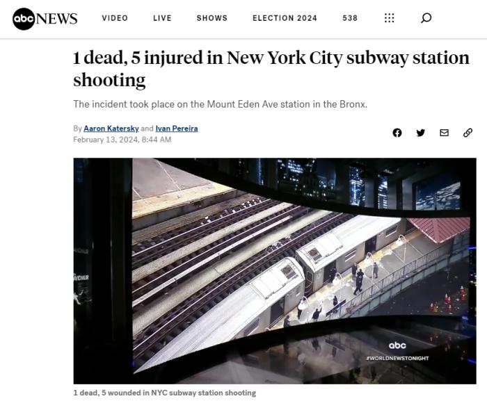 中新網(wǎng)2月13日電 據(jù)美國(guó)廣播公司(ABC)報(bào)道,當(dāng)?shù)貢r(shí)間12日下午,美國(guó)紐約布朗克斯一個(gè)地鐵站發(fā)生槍擊事件,造成1人死亡,5人受傷。