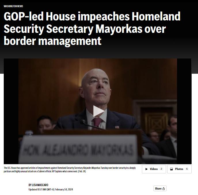 中新網(wǎng)2月14日電 綜合美媒報(bào)道,當(dāng)?shù)貢r(shí)間13日,美國(guó)眾議院批準(zhǔn)了針對(duì)邊境安全問(wèn)題對(duì)國(guó)土安全部長(zhǎng)馬約卡斯的彈劾條款,使他成為自1876年以來(lái)首位被眾議院彈劾的內(nèi)閣部長(zhǎng)。
