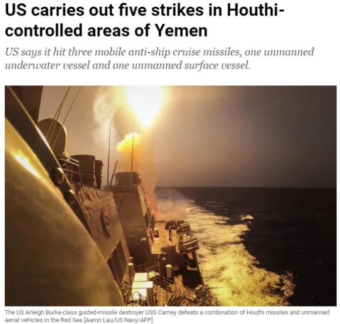 美國對(duì)胡塞武裝連續(xù)發(fā)動(dòng)五次空襲 擊中多枚導(dǎo)彈和艦艇