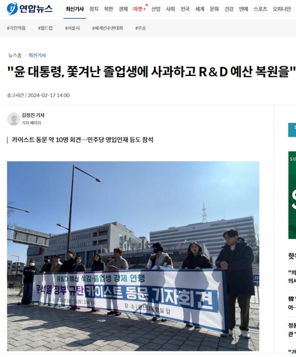 17日,韓國科學技術研究院的校友在龍山總統(tǒng)府前舉行記者會,他們表示:“尹錫悅總統(tǒng)毫不留情地堵住畢業(yè)生的嘴,并將其趕了出去,對此我們感到非常憤怒?!彼麄円笠a悅道歉,并恢復削減的研究與開發(fā)預算。