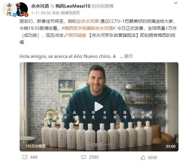 1月11日,梅西發(fā)博官宣牽手赤水河酒。梅西個(gè)人微博發(fā)文稱,梅西簽字祝福款赤水河酒當(dāng)日正式發(fā)售,全球限量1萬件,并配上了一段梅西為酒瓶一一簽名的宣傳視頻。