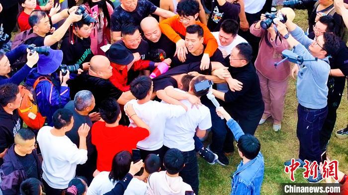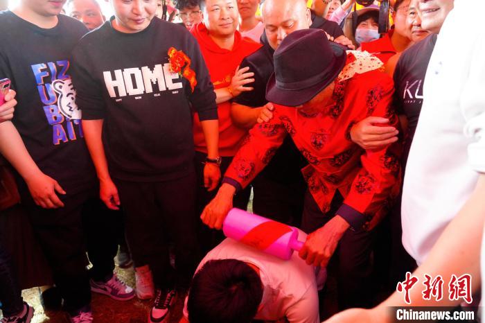 “酒醉公”手持搟面杖,逐一“打”前一年剛結(jié)婚的“新郎官”。永定區(qū)融媒體中心供圖