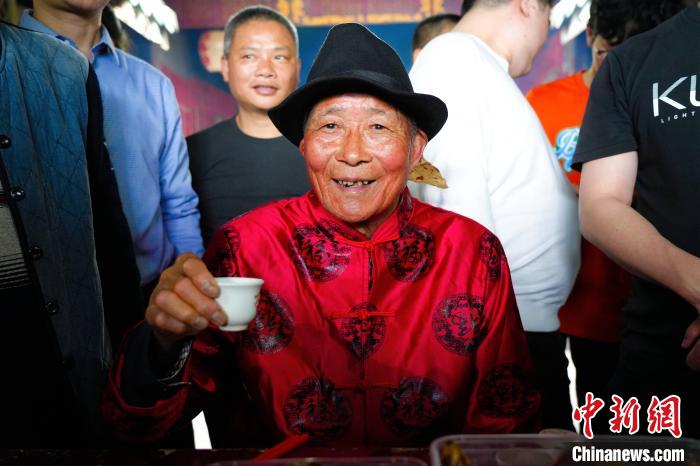 只見“酒醉公”身著紅色唐裝,頭戴禮帽,右手舉著一只面棰,用紅紙包著,寫有“早生貴子”4個(gè)字。他逐一“打”前一年剛結(jié)婚的“新郎官”,從他們的左肩上輕輕滾打而下,再從下滾打上右肩,邊滾打,邊講些祝愿他們夫婦新婚添丁、幸福美滿的吉祥話。