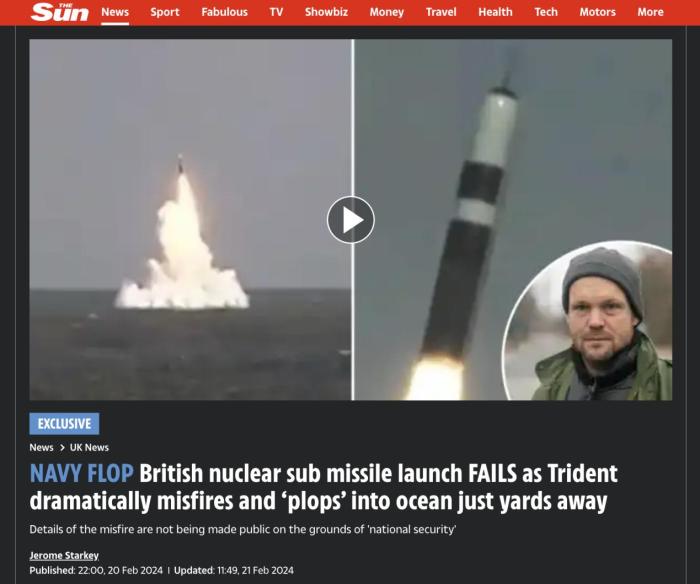 該部在發(fā)給《太陽報》的一份聲明中表示:“‘先鋒’號及其船員已被證明完全有能力操作英國的海上威懾力量。此次試射再次證實了英國核威懾力量的有效性,我們對此擁有絕對信心。測試過程中出現(xiàn)了異常情況。出于國家安全的考慮,我們無法提供有關(guān)此問題的進一步信息,但我們相信該異常是針對特定事件的,因此對更廣泛的‘三叉戟’導彈系統(tǒng)和庫存的可靠性沒有影響。”