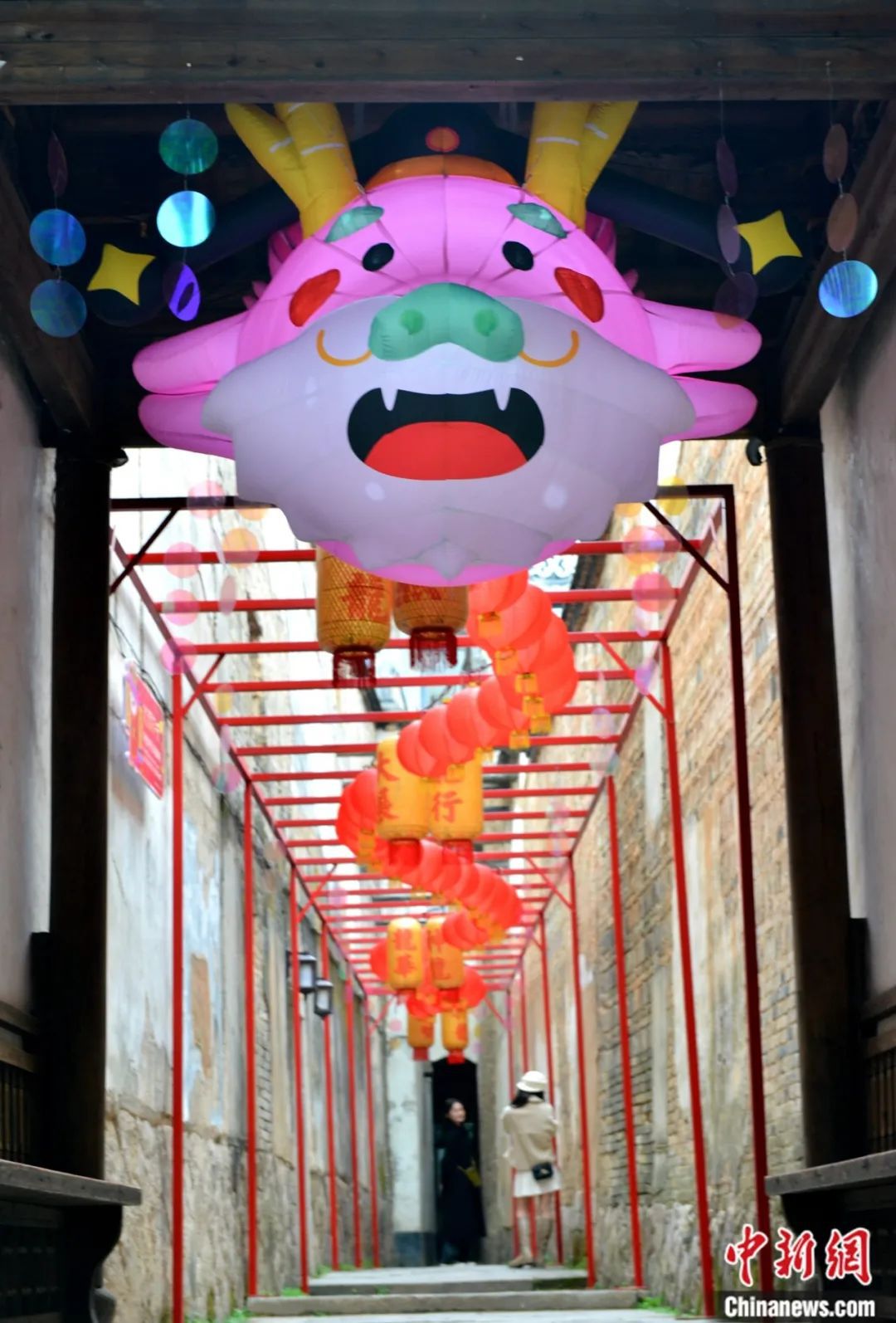 “龍?jiān)亍彼囆g(shù)主題裝置亮相福州上下杭?xì)v史文化街區(qū),活潑的造型與古厝形成鮮明對(duì)比。中新社記者 呂明 攝