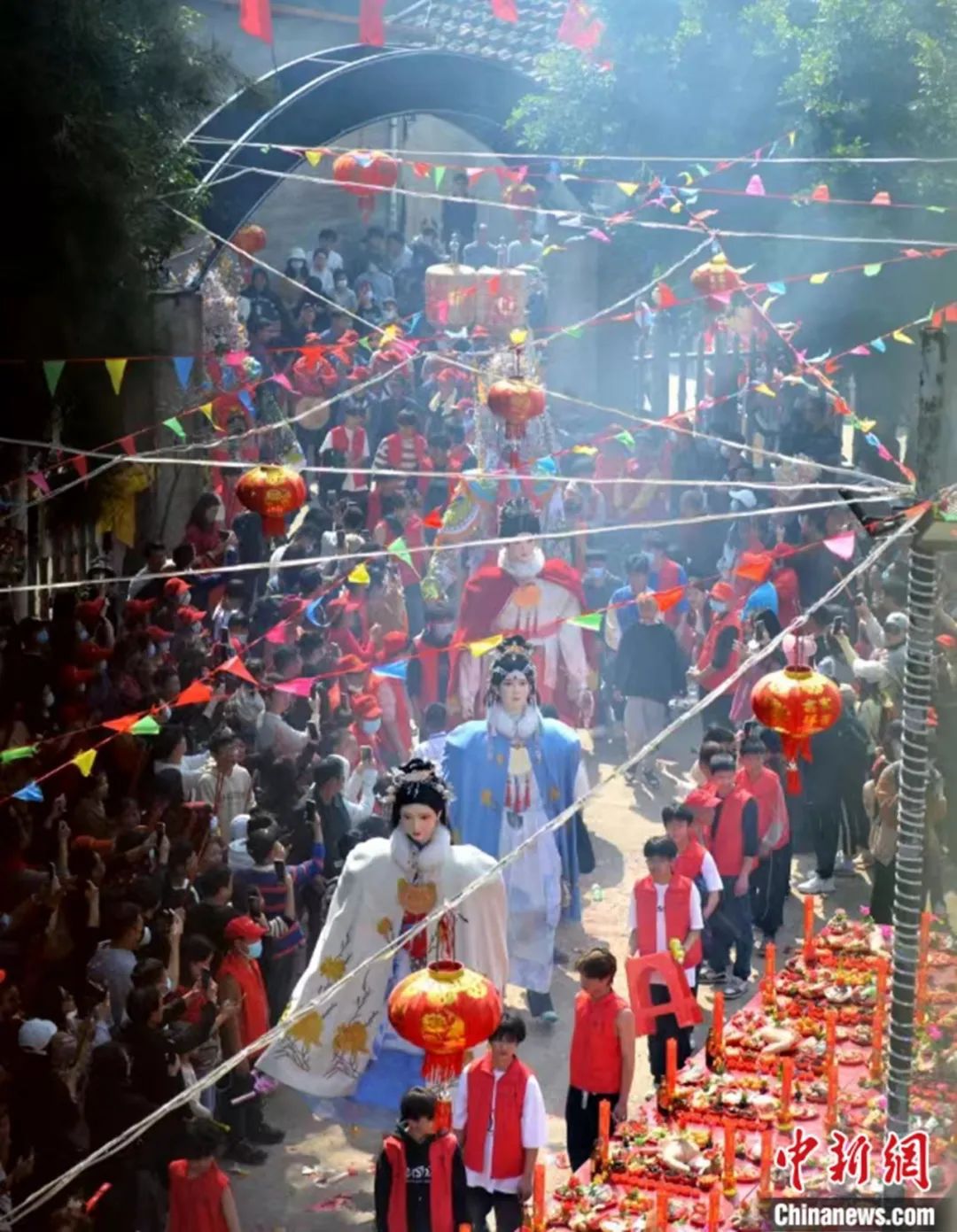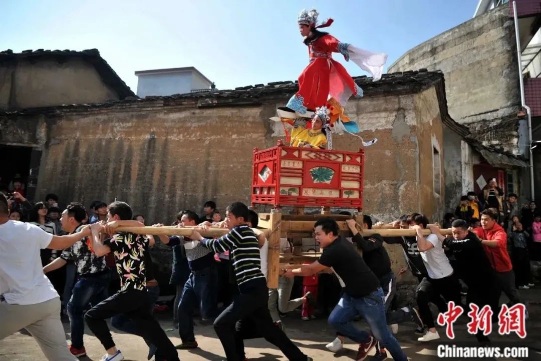 每年正月初十及正月二十六,潭頭鎮(zhèn)厚福村都會(huì)舉行傳統(tǒng)游神民俗活動(dòng),至今已有400多年的歷史。圖為傳統(tǒng)游神民俗活動(dòng)中的巡游隊(duì)伍簇?fù)碇ι駥⒌娜俗呓执铩V行律缬浾?呂明 攝