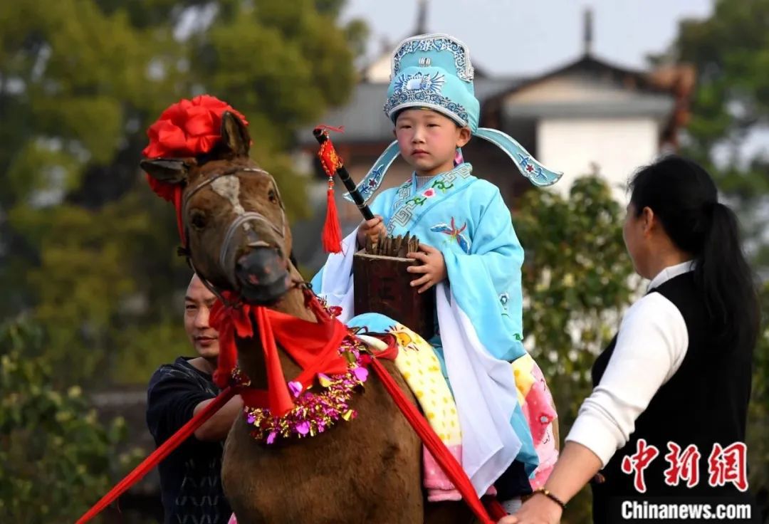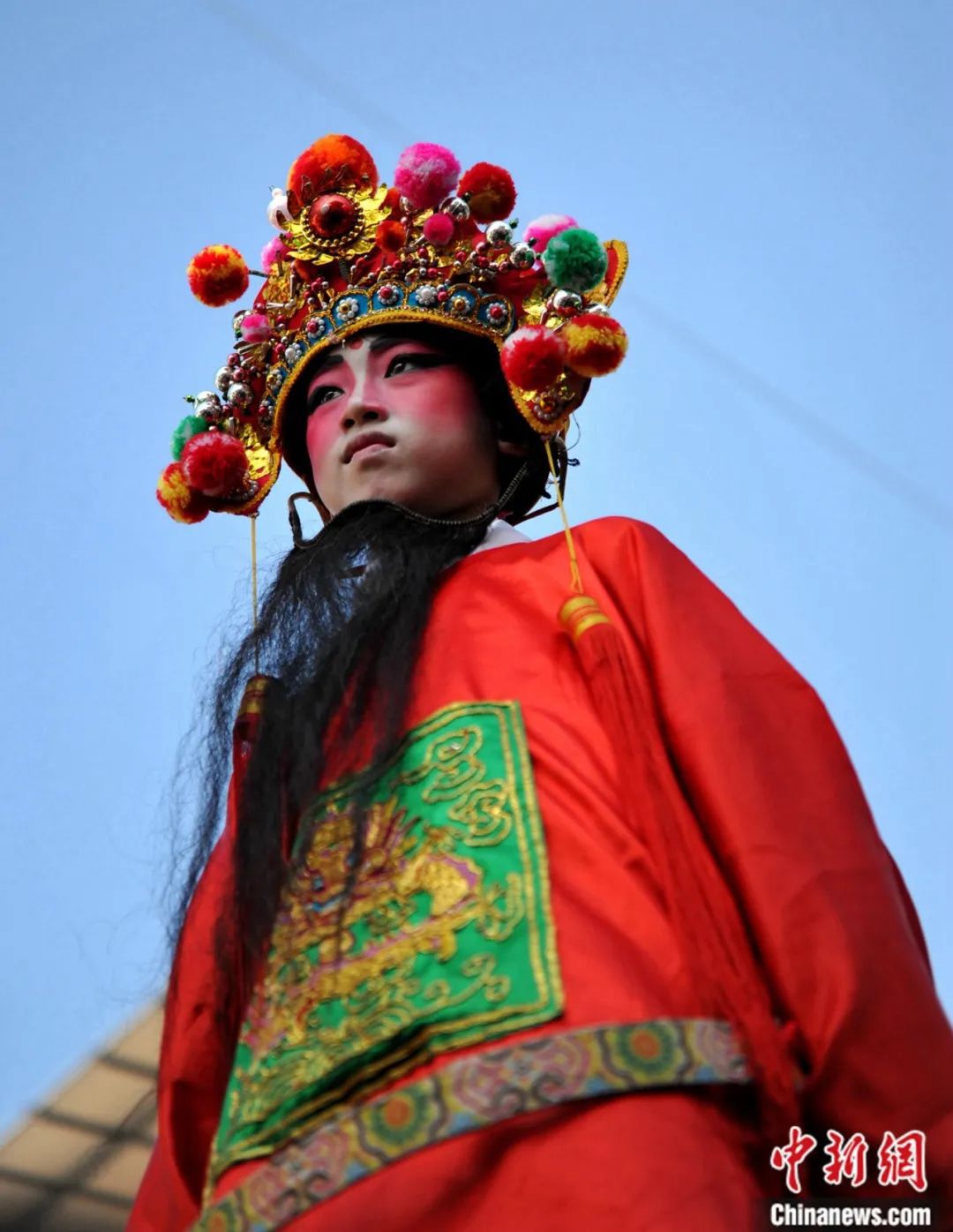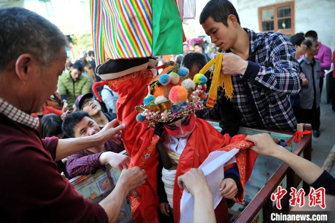 連城縣羅坊鄉(xiāng)舉行國家級(jí)非物質(zhì)文化遺產(chǎn),享有“中國客家狂歡節(jié)”美譽(yù)的“走古事”民俗活動(dòng)。圖為立于轎臺(tái)之上參加“走古事”的兒童。中新社記者 張斌 攝