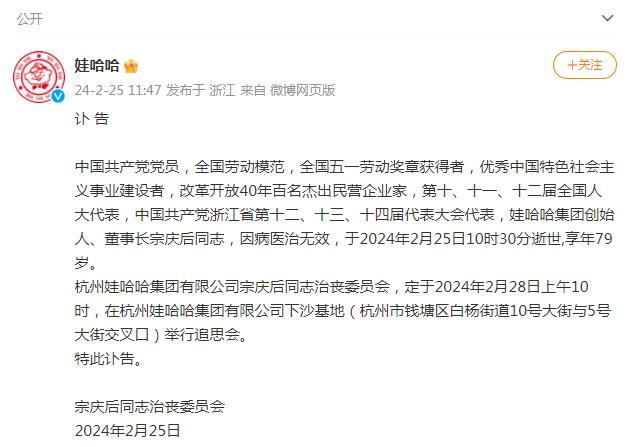 中新網(wǎng)2月25日電 據(jù)娃哈哈集團官方微博消息,娃哈哈集團創(chuàng)始人、董事長宗慶后因病醫(yī)治無效,于2024年2月25日10時30分逝世,享年79歲。