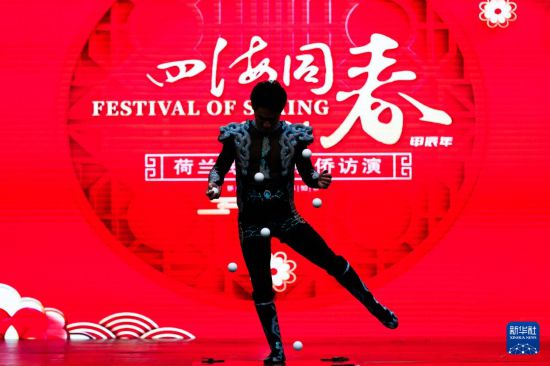 2月22日,演員在荷蘭阿姆斯特丹舉行的“四海同春”慰僑訪演活動(dòng)上表演雜技。新華社記者 孟鼎博 攝