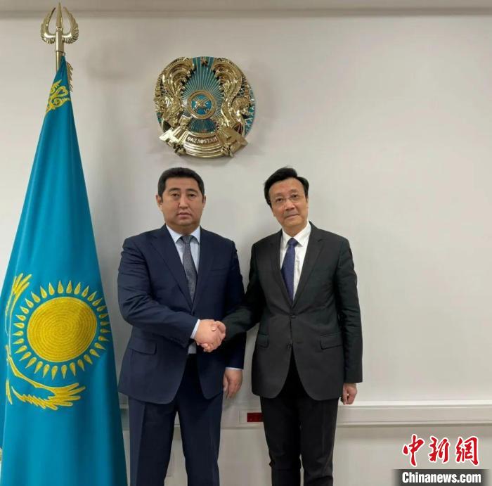 當(dāng)?shù)貢r間3月4日,大使張霄(右一)會見哈農(nóng)業(yè)部長薩帕羅夫。中國駐哈薩克斯坦大使館供圖