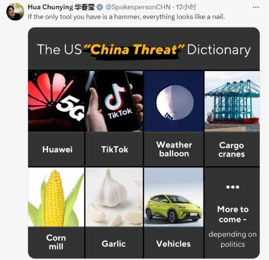 華春瑩最后回?fù)?,“如果你唯一的工具是錘子,那么所有東西看起來都像釘子。”這條帖文隨附圖片上,列出美國以往炒作“中國威脅”的詞典:包括華為,TikTok,氣象無人飛艇,起重機(jī),玉米加工廠,大蒜,汽車……還有更多,取決于政治因素?!?/p>