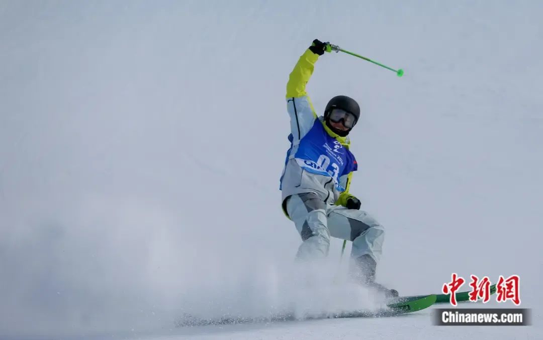 “十四冬”自由式滑雪公開(kāi)組男子大跳臺(tái)冠軍楊昊,在扎蘭屯金龍山滑雪場(chǎng)參加比賽。 牛天甲 攝
