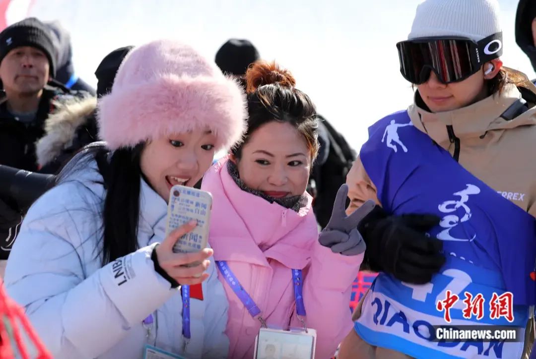 “十四冬”單板滑雪大跳臺(tái)公開(kāi)組男子決賽現(xiàn)場(chǎng),觀眾找比完賽的蘇翊鳴(右一)合影。 韓冷 攝