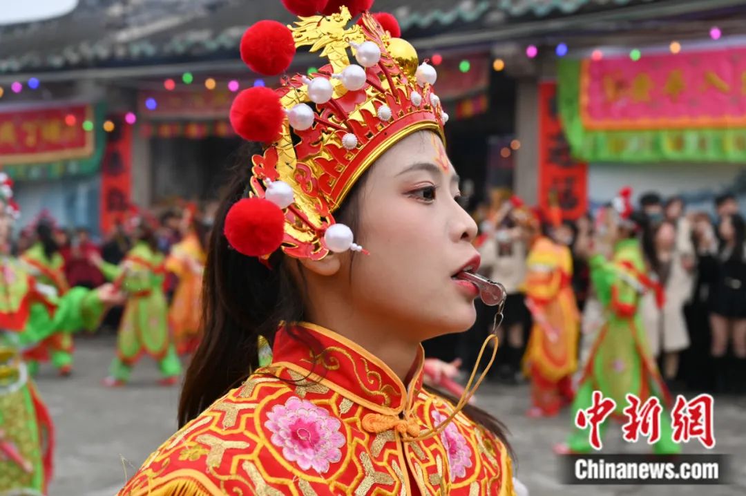 2023年2月9日,廣東潮州,潮陽(yáng)西門女子英歌隊(duì)亮相仙都鄉(xiāng)媽祖文化巡游活動(dòng)。陳楚紅 攝
