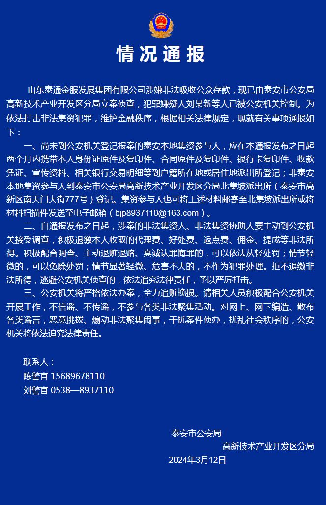 中新網(wǎng)3月13日電 山東泰安高新警方12日在官方微信公眾號發(fā)布山東泰通金服發(fā)展集團(tuán)有限公司涉嫌非法吸收公眾存款的情況通報(bào),目前該案件已由泰安市公安局高新技術(shù)產(chǎn)業(yè)開發(fā)區(qū)分局立案偵查,犯罪嫌疑人劉某新等人已被公安機(jī)關(guān)控制。為依法打擊非法集資犯罪,維護(hù)金融秩序,根據(jù)相關(guān)法律規(guī)定,現(xiàn)就有關(guān)事項(xiàng)通報(bào)如下: