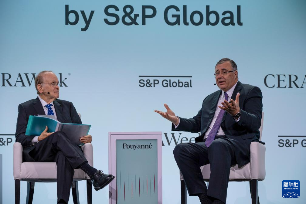 3月18日,法國(guó)道達(dá)爾能源首席執(zhí)行官帕特里克·普亞納(右)在美國(guó)休斯敦舉行的能源界高端會(huì)議“劍橋能源周”上分享觀(guān)點(diǎn)。新華社發(fā)(陳晨攝)