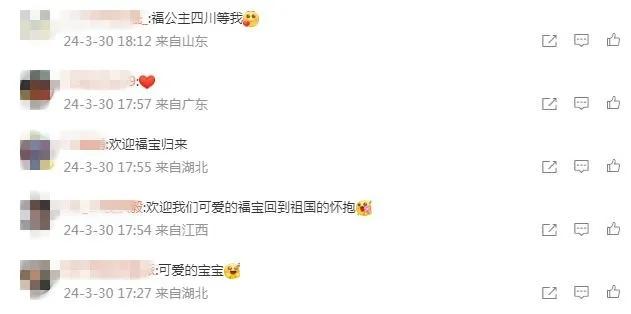 有網(wǎng)友寫(xiě)道,祝愿“福寶”一切順利,“能很快適應(yīng)新環(huán)境”。還有網(wǎng)友表示,“福寶回國(guó)后一定也要福氣滿滿,永遠(yuǎn)幸福哦!”