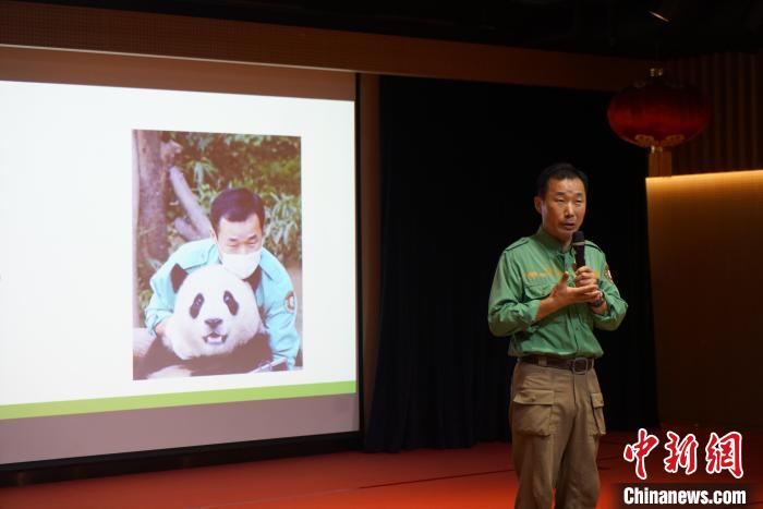 資料圖:姜哲遠(yuǎn)講述養(yǎng)育大熊貓“福寶”的故事。中新網(wǎng)記者 劉旭 攝